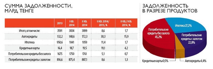 Рост суммы задолженности в течение шести месяцев нынешнего года произошел во всех сегментах розничного кредитования. Наиболее высокую динамику роста показало автокредитование (+30,3% относительно декабря 2013), однако в абсолютном выражении основной прирост рынка произошел за счет ипотечного кредитования, которое прибавило 108,4 млрд тенге, достигнув значения 1,06 трлн тенге.