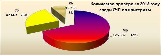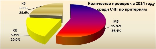 - из них малый бизнес – 2 820, средний бизнес - 931, в целом малый и средний бизнес – 3 750 проверок, удельный вес 10,0% от всех проверок (в 2013 году – 62,0%), или 44,1% от проверок субъектов частного предпринимательства (в 2013 году – 92,1%).