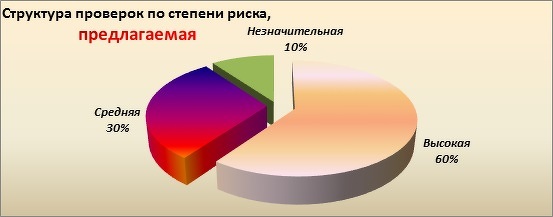 - наметилась динамика к снижению в незначительной группе риска, но ее темпы недостаточны, т.к. удельный вес проверок с высокой группой риска должен быть порядка 60%, со средней группой риска – 30%, а с незначительной группой риска – не более 10%;