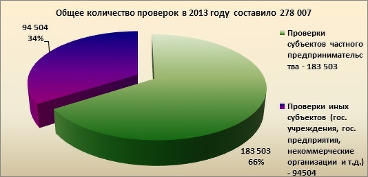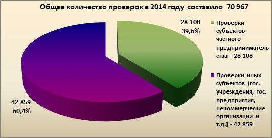 - в том числе субъектов частного предпринимательства 28 109, удельный вес – 39,6% (в 2013 году - 64,6%). То есть благодаря введенному мораторию на проверки субъектов МСБ кардинально изменилась ситуация с проверками, если в прошлом году 2/3 проверок затрагивали именно субъектов частного предпринимательства, то в текущем году, наоборот, только 1/3;