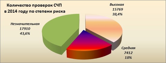 Удельный вес проверок с незначительной группой риска составил 43,6%, при 57,8% за 9 месяцев 2013 года. Наметилась динамика к снижению в этой группе, но ее темпы незначительны. Спрашивается, зачем «кошмарить» там, где нет особой необходимости, не лучше ли заниматься не увеличением количества проверок, а сфокусироваться на их эффективности, и именно там, где высоки риски нарушений. На наш взгляд, удельный вес проверок с высокой группой риска должен быть порядка 60%, со средней группой риска – 30%, а с незначительной группой риска – не более 10%.