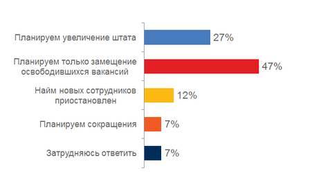 Согласно опросу, только 7% работодателей все еще планируют сокращать персонал. Рынок труда находится в нейтральном состоянии ожидания: большинство компаний открывают вакансии только для замещения освободившихся должностей. Тем не менее, есть и положительные тенденции: нанимать сотрудников собирается каждый четвертый работодатель (27%).