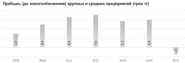 Увеличивая непроизводственные расходы и уменьшая материальные затраты, крупному бизнесу не удалось показатель прибыльность деятельности в 2015. По итогам прошлого года крупные и средние предприятия совокупно получили убыток в размере 1 трлн тенге, тогда как годом ранее они зафиксировали чистую прибыль в сумме 5,9 трлн тенге.