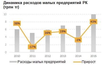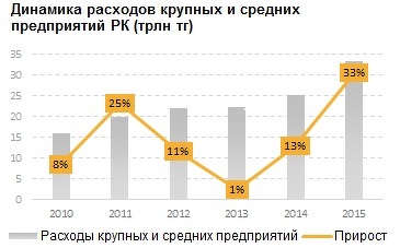 При этом, по сравнению с ростом расходов малых предприятий, крупные и средние компании увеличили свои затраты менее значительно. В денежном выражении прирост объема расходов малых предприятий меньше - 3 трлн тенге за 2015, однако эта сумма составляет 43% от уровня затрат малого бизнеса в 2014.