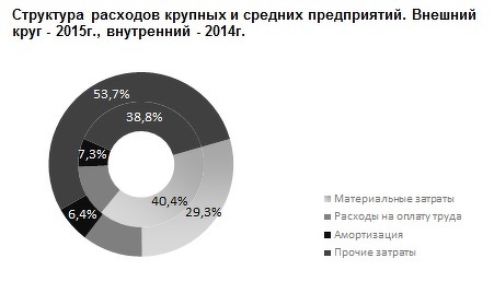 Прочие расходы формируются из сумм налогов, обязательных сборов, арендной платы, услуг сторонних организаций (непроизводственного характера), затраты по кредитам банков, представительске расходы и др. В 2015 такие расходы формировали 54% всей суммы затрат крупных и средних предприятий (в 2014 - меньше 39%).