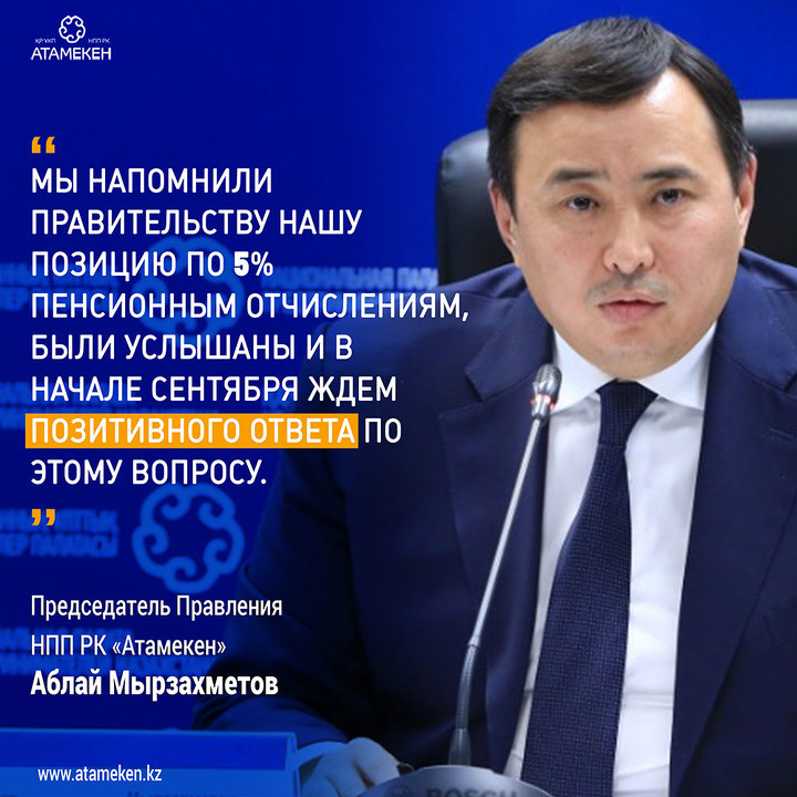 С властью мы работаем конструктивно, мы не можем предъявлять ультиматумы, грозить митингами. Была критика в соцсетях - почему «Атамекен» не митингует? Скажу однозначно: это не наш стиль. «Атамекен» – не политическая организация, мы работаем в конструктивном поле. У нас нет права вето. Месяц назад мы напомнили правительству нашу позицию по этой проблеме. Мы были услышаны, и в начале сентября ждём позитивного ответа по этому вопросу. Давайте наберёмся немного терпения.