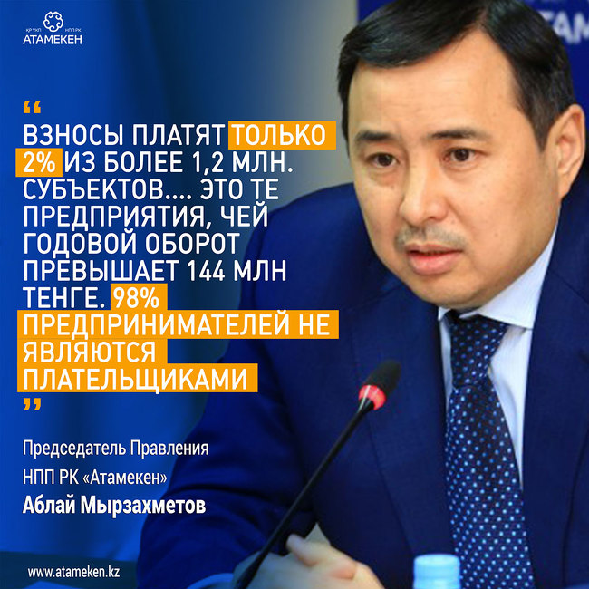 В прошлом году из этих 2% внесли оплату 65%, а в этом году мы ставим себе планку достичь 70%. Все эти годы мы идём методом убеждения. В первый год обязательные членские взносы внесли 40%, то есть каждый год мы повышали лояльность наших плательщиков. И мы им благодарны. И самое главное - решение о взносах принимают не чиновники, не сотрудники НПП, а съезд «Атамекена».