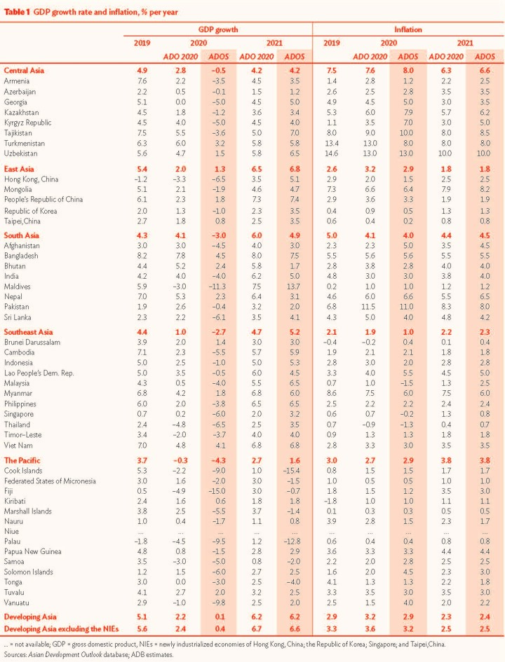 В регулярном дополнении к своей ежегодной ведущей экономической публикации «Обзор развития Азии 2020» (ОРА) АБР прогнозировал рост на уровне 0,1% для региона в 2020. Это ниже апрельского прогноза в 2,2% и самый медленный рост для региона с 1961 года. Как и в апрельском прогнозе, ожидается, что рост экономики в 2021 усилится до 6,2%. Уровень валового внутреннего продукта (ВВП) в следующем году останется ниже прогнозировавшегося ранее и ниже докризисных показателей.