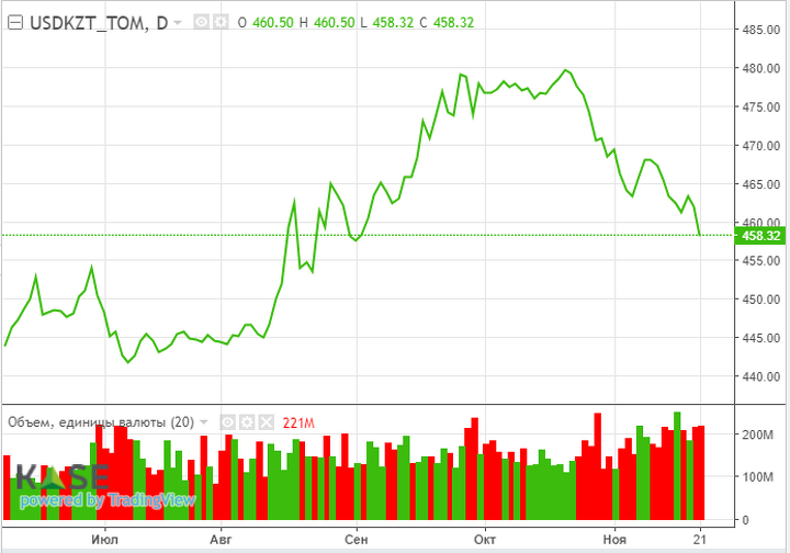 По итогам торгов вторника, 21 ноября, на KASE курс по паре USDKZT опустился до 459 тенге за доллар (-3,55 тенге) при высоком объёме торгов – $221,4 млн (+$2,5 млн). Такие повышенные объёмы могут свидетельствовать о конвертации валютной выручки экспортёрами для уплаты рентного налога, НДПИ и НДС. Поскольку срок уплаты указанных платежей в бюджет завершается 27 ноября, продажи инвалюты экспортёрами могут происходить до конца текущей недели.