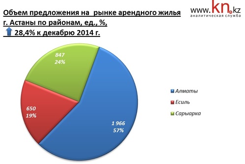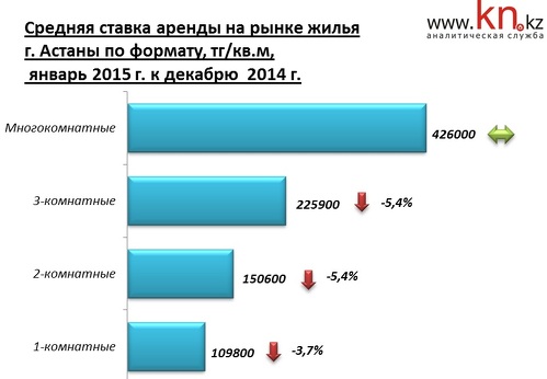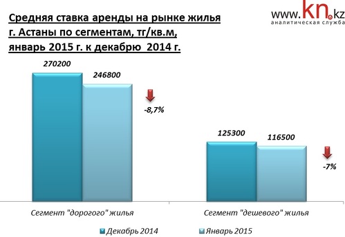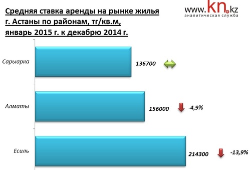 - В январе 2015 основное снижение пришлось на район Есиль, в целом в Астане подешевела аренда 1-, 2- и 3-комнатных квартир. Наибольшее снижение арендных ставок зафиксировано в дорогом сегменте арендного жилья, преимущественно на 2- и 3-комнатные квартиры.