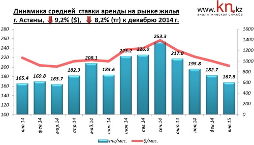 Рынок аренды жилья Астаны в январе продолжил отыгрывать сезонный рост ставок, наблюдавшийся в июле, августе и сентябре 2014. За эти месяцы ставки аренды в тенге выросли почти на 35%. С октября по январь ставки снизились на 34%, опустившись до уровня начала 2014.