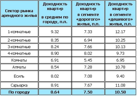 Однако снижение цен как на рынке продажи, так и на рынке аренды жилой недвижимости привело к сокращению показателя доходности жилья с 9,9% в сентябре 2014 до 8,6% годовых в январе 2015. Среднегодовая доходность по банковским вкладам в тенге в январе 2015 составила 10% годовых (средняя ставка вознаграждения собрана по данным 10 крупнейших банков Казахстана). Сравнение доходности жилья с доходностью по депозитам говорит о том, что инвестиции в жилье являются хоть и надежным, но не самым прибыльным бизнесом. Вместе с тем, по данным аналитической службы kn.kz, доходность в сегменте дешевого жилья находится немного выше уровня банковского вознаграждения. Доходность по однокомнатным квартирам выше на 2,2%. Таким образом, наиболее доходным инвестиционным вариантом являются недорогие однокомнатные квартиры.