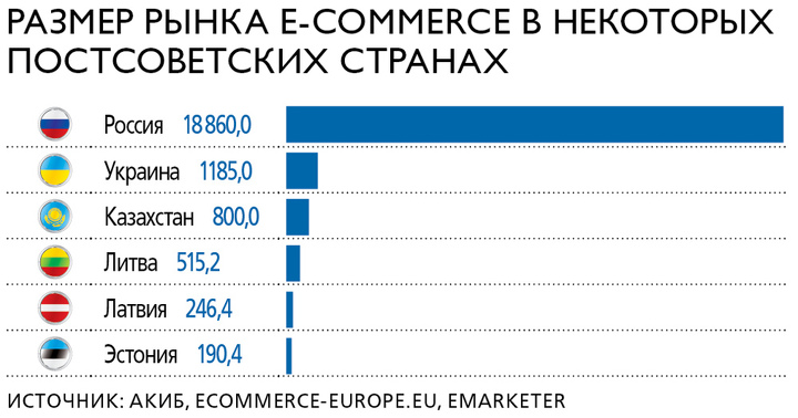 Из постсоветских стран только по шести имеется оценка рынка. Здесь лидирует, естественно, Россия. Вторую строку занимает Украина, рынок электронной коммерции которой оценивается специалистами Ecommerce Europe в $1,2 млрд. Далее следует Казахстан: согласно оценке экспертов АКИБ, наш рынок в 2015 году «потянул» на $800. Ниже расположились страны Балтии: Литва – $515,2 млн, Латвия – $246,4 млн, Эстония – $190,4 млн.