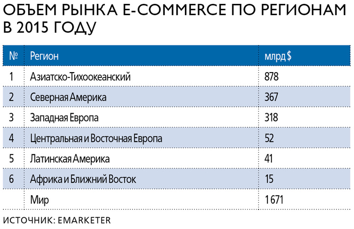 Что касается удельного веса разных регионов в общем объеме, то самый крупный это Азиатско-Тихоокеанский, который оценивается почти в $900 млрд. На втором месте, причем с большим отставанием, Северная Америка – $367 млрд. Почти столько же у Западной Европы – $318 млрд, а вот у Восточной в разы меньше – $52 млрд. В странах Африки и Ближнего Востока интернет-торговля находится в зачаточном состоянии: там вес рынка составляет всего $14,7 млрд, что сопоставимо с одной Испанией.
