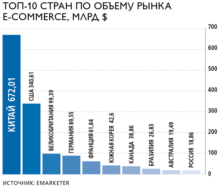 85 % всего глобального спроса на товары, купленные через интернет, сосредоточен в первой десятке стран. Так, больше всего продукции электронным способом приобрели в Китае – на $672 млрд. Неудивительно, что капитализация корпорации Alibaba, принадлежащей Джеку Ма, приближается к $200 млрд. На втором месте этого ренкинга находятся США. В среднем один американец потратил на онлайн-покупку в 2015 году более $1 тыс., что в сумме дало $340 млрд. Совокупный объем рынка e-commerce Великобритании оценивается в менее чем $100 млрд, что ставит ее на третье место. Далее по списку идут Германия – $89,6 млрд, Франция – $61,8 млрд, Южная Корея – $42,6 млрд и Канада – $38,9 млрд. Замыкают десятку лидеров Бразилия – $26,8, Австралия – $19,5 и Россия – $18,9 млрд.