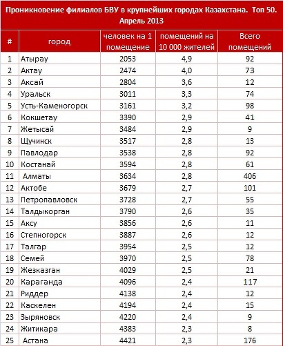 Финансовый центр Казахстана Алматы - на 11 месте: одно банковское помещение приходится на 3,6 тыс. человек. Столица - на 25 месте. Средний охват одного банковского помещения в Астане - 4,4 тыс. человек. В целом по Казахстану плотность филиальной банковской сети составляет 7,1 тыс. человек на одно банковское помещение.