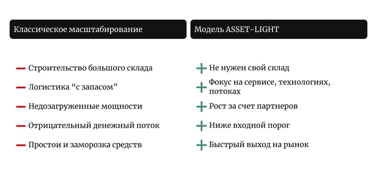 Модель asset‑light («легкие активы») предполагает, что компания минимизирует владение физическими ресурсами и концентрируется на сервисе, технологиях, интеграциях и управлении потоками. Основная идея asset‑light в том, что вместо строительства собственных складов компания подключается к уже существующим хабам, используя их как часть своей операционной модели. Физически актив остается у партнера, но технологически и управленчески он работает как продолжение бизнеса. Это снижает входной порог, позволяя быстрее выходить на рынок и выходить на окупаемость.