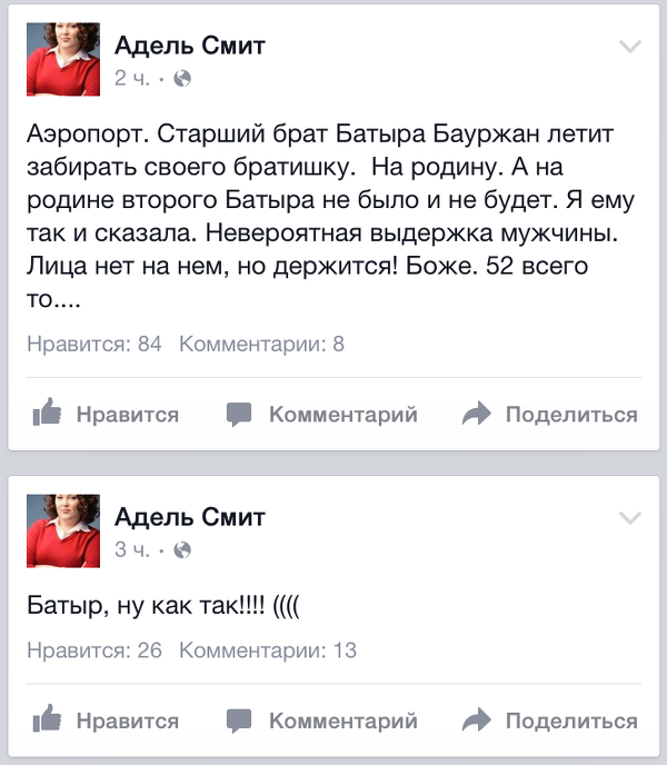«Аэропорт. Старший брат Батыра Бауржан летит забирать своего братишку. На родину. А на родине второго Батыра нет и не будет. Я ему так и сказала. Невероятная выдержка мужчины. Лица на нем нет, но держится. Боже. 52 всего-то…», - написала Адель Оразалинова, известная в Сети как Адель Смит.
