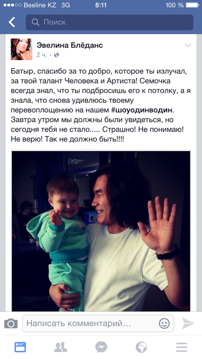 Свои сожаления по поводу кончины Батырхана Шукенова выразила на своей странице в Facebook и известная российская актриса Эвелина Бледанс.