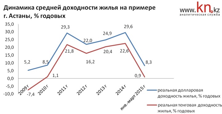 Рынок жилья, хорошо знакомый большинству стабильный и надежный инструмент, даже в сложные для экономики времена способен приносить минимум 8-10% годовых за счет аренды. Если же рынок находится в стадии роста, прибавим к этому показателю темп прироста стоимости, «очистим» его от инфляции и получим 25-30% годовых реального дохода. По расчетам аналитиков kn.kz, реальная доходность инвестиций в жилье в период с 2010 по 2014 составляла в среднем 18,5% годовых.
