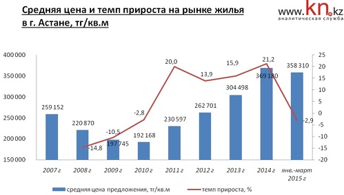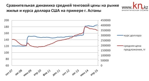 Девальвация тенге в феврале 2014 вогнала рынок недвижимости в стагнацию. Средняя долларовая цена на рынке жилья в РК сократилась с того момента на 10%, тенговая — на 2,9%. По регионам существенных различий в динамике нет: темпы снижения цен варьируются от 8% до 11% в годовом выражении. Наблюдается значительное сокращение сделок купли-продажи.