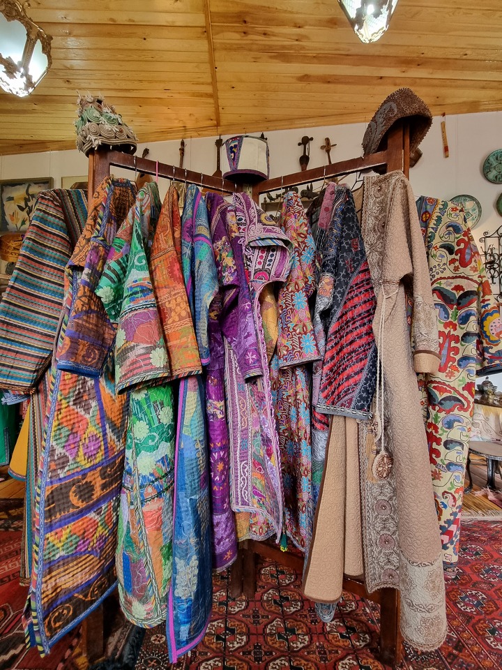 На одной из таких прогулок нам повезло найти мастерскую Happy Bird, где изготавливаются чапаны с современным дизайном для различных выставок. В этот раз мастера готовились к выставке в Сан-Тропе. Каждое изделье уникально и изготавливается из винтажных отрезов натуральных тканей, таких как шелк и хлопок, залежавшихся в бабушкиных сундуках. Задача мастеров - скроить из них стандартных размеров изделие, соблюдая всю технологию, и подобрать гармоничное сочетание принтов. Только после завершения выставок изделия можно приобрести.