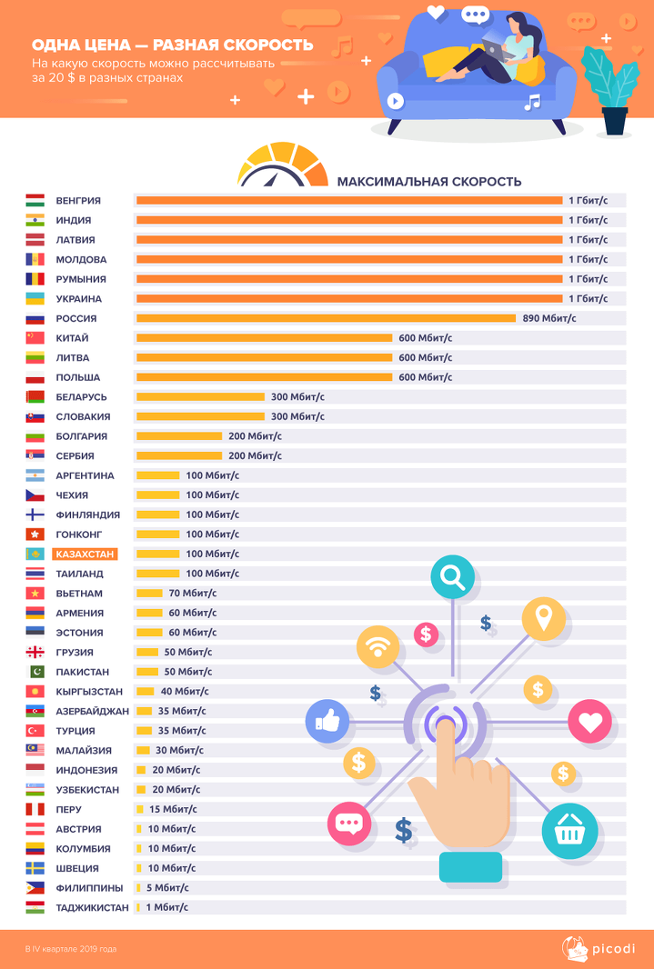 Высокоскоростной интернет 1 Гбит/с по стоимости ниже $20 можно найти в Румынии, Украине, Венгрии, Индии, Молдавии и Латвии. В России по такой цене доступен высокоскоростной интернет 890 Мбит/с, в Китае, Польше и Литве — 600 Мбит/с, а в Казахстане — 100 Мбит/с.