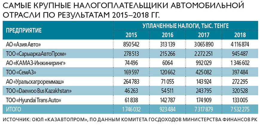 Инвестиции предприятий автопрома в основной капитал превысили 3 млрд тенге, при этом они обеспечили налоговые поступления в бюджет в размере 55 млрд тенге – на четверть выше показателя 2017. Расходы населения на приобретение автомобилей казахстанского производства составили 182,5 млрд тенге. В пятерку наиболее востребованных легковых авто местной сборки вошли LADA, Hyundai, KIA, JAC, Chevrolet.