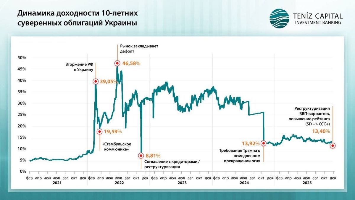 — До 2022 года 10-летние суверенные облигации Украины торговались вблизи 100-110% от номинальной стоимости. После вторжения РФ в Украину в конце февраля 2022 года, цены обвалились и опускались до 19-20% в начале марта, отражая сценарий глубокого кредитного стресса и ожидания дефолта. Потом ситуация стала интересней, так как дальнейшее движение — это уже не экономика в классическом смысле, а торговля ожиданиями: переговоры, реструктуризация, политические сигналы, ожидания деэскалации. Другими словами, с локальных минимумов в диапазоне 15-20% в марте–июле 2022 года цена на пике в конце 2025 — начале 2026 г. (выше 62%) выросла более чем в 3 раза, что соответствует росту примерно на +200% исключительно за счет переоценки риска.