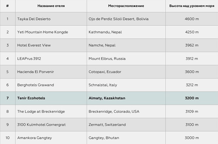 В декабре 2020 года на горном курорте Shymbulak Mountain Resort откроется новый хоспиталити-проект — экоотель Tenir, расположенный на высоте 3200 м в окружении горных массивов Заилийского Алатау. Внутренним анализом было выявлено, что он станет седьмым самым высокогорным отелем в мире после таких знаменитых локаций, как Tayka Del Desierto Ojo de Perdiz Siloli Desert в Боливии (4600 м), Yeti Mountain Home Kongde Kathmandu (4250 м) и Hotel Everest View Namche (3962 м) в Непале, LEAPrus 3912 Mount Elbrus в России (3912 м), Hacienda El Porvenir Cotopaxi в Эквадоре (3600 м) и Berghotels Grawand Schnalstal в Италии (3212 м).