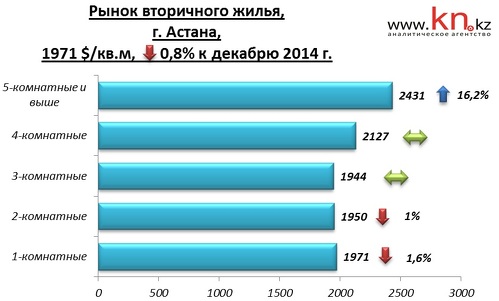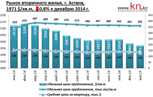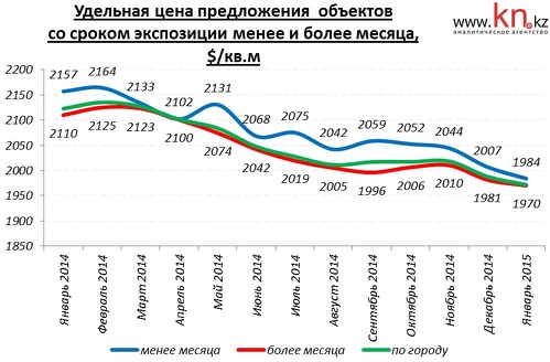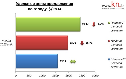 По наблюдениям аналитиков kn.kz, в январе 2015 средние цены в сегменте дорогого жилья сократились, а в сегменте дешевого – не изменились. За год снижение в обоих сегментах составило около 6,5%.