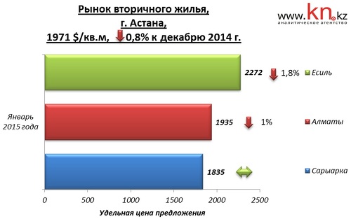 По данным аналитической службы kn.kz, в январе 2015 наибольшее снижение цен наблюдается в новом административном районе Есиль — на 1,8%. Цены на квартиры в районе правого берега Алматы снизились на 1%, цены на квартиры в районе Сарыарка не изменились.