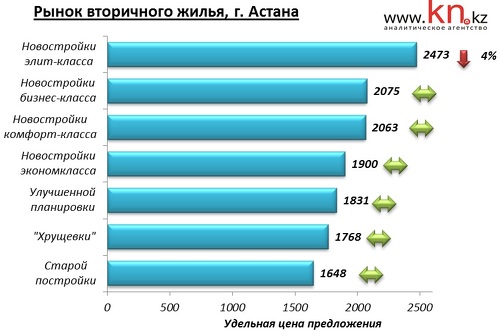 - Согласно прогнозам аналитической службы kn.kz, на вторичном рынке жилья столицы в среднесрочной перспективе ожидается дальнейшее сокращение долларовых цен в пределах 0,5-1% за месяц.