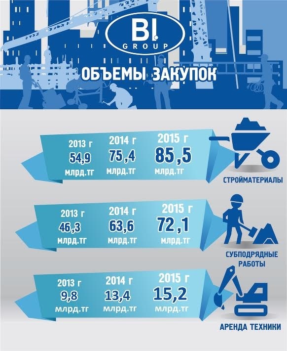 Напомним, что сегодня BI Group с оборотом более 260 млрд тенге представляет два холдинга и 12 дивизионов. 8 тысяч человек трудятся на более чем 80 проектах компании по всей территории Казахстана. 20 тысяч человек из субподрядных и смежных организаций участвуют в проектах BI. Среди крупных проектов, реализуемых сегодня, можно назвать участие в гражданском и промышленном строительстве в рамках ЭКСПО-2017, возведение экологичного и энергоэффективного «Зеленого квартала», строительство Назарбаев Интеллектуальных школ и колледжей мирового уровня, сухого порта «Хоргос - Восточные ворота», инфраструктурное строительство в рамках программы «Нурлы Жол» и другие.