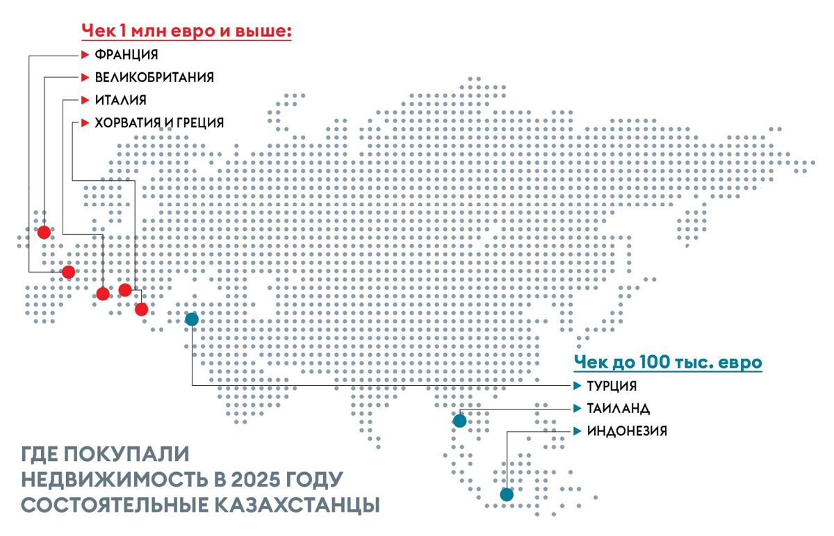 В 2025 году медианный чек казахстанской элиты по сделкам «для переезда» составил примерно 1,2 млн евро, на 800 тыс. выше средних бюджетов инвестиционных сделок в ЮВА и странах Персидского залива.