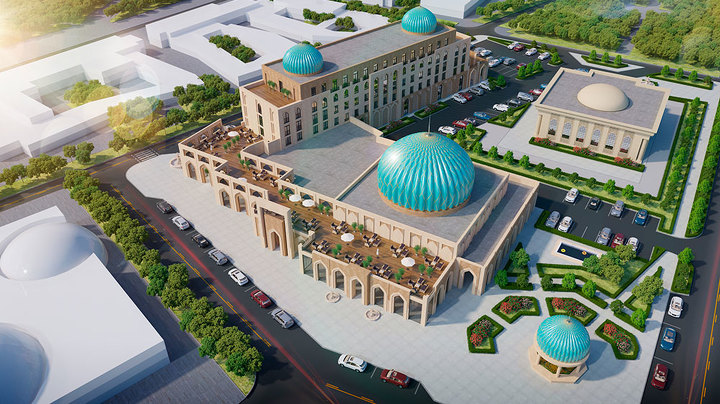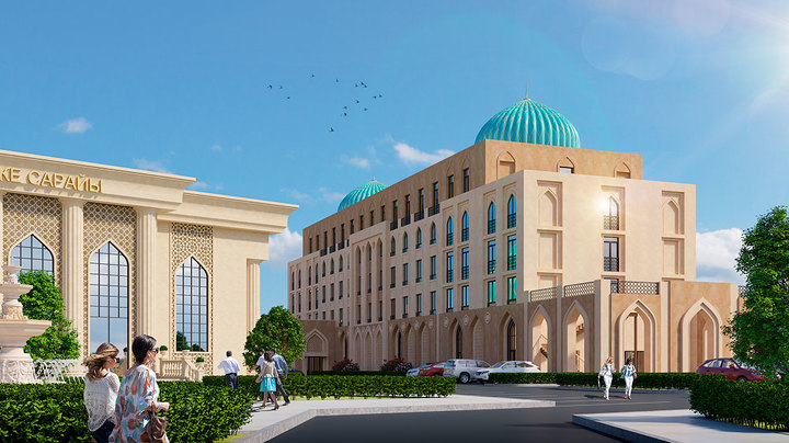 Отель расположится в историческом центре города. Из его окон откроется вид на мавзолей Ходжи Ахмета Яссауи – памятник истории и культуры, включённый в список всемирного наследия ЮНЕСКО. Также в шаговой доступности будут расположены основные туристические и культурные достопримечательности одного из самых посещаемых туристами городов Казахстана. Кроме того, на прилегающей к отелю территории будет построен дворец бракосочетаний.