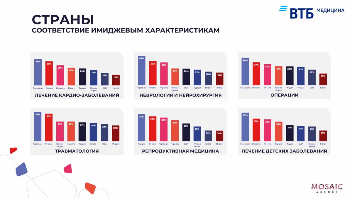 Восприятие стран складывается из доступности информации, уровня сервиса и медицинских компетенций. Россия стабильно входит в число наиболее рассматриваемых направлений. Большинство жителей СНГ включают ее в список возможных стран для лечения; 43% считают лечение в российских клиниках доступным — это максимальный показатель в исследовании. Еще 29% рассматривают лечение в будущем, что также выводит страну на первое место по потенциальному интересу. Страна занимает заметные позиции в восприятии конкретных направлений: второе место в кардиологии, репродуктивной медицине, травматологии, неврологии и нейрохирургии. Ассоциативные данные это подтверждают: 35% связывают Россию с неврологией и нейрохирургией, 34% — с хирургическими вмешательствами, 32% — с репродуктивной медициной и 32% — с лечением детских заболеваний.
