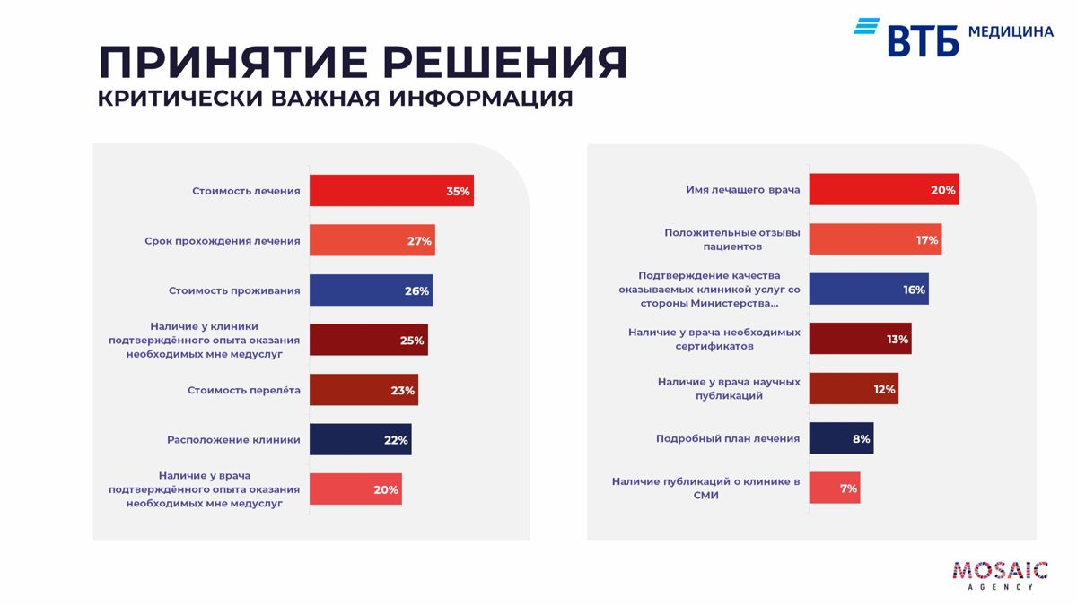 Организация процесса также влияет на выбор. Треть пациентов сами ищут специалистов, обращаются напрямую в клиники, сравнивают предложения и собирают необходимые документы, 29% привлекают друзей и знакомых, проживающих в выбранной стране. Агентства медицинского туризма используются точечно — главным образом для поиска уникальных специалистов, информацию о которых не найти самостоятельно в интернете, переговоров с клиниками для получения плана лечения и цен; полностью делегируют организацию лишь 17%. Возможность общаться на понятном языке важна для 22% опрошенных: это повышает качество коммуникации и снижает стресс. Людям важны ясные объяснения — что означает диагноз, какие исследования необходимы, зачем назначаются процедуры и какие есть альтернативы. Риск необходимости проводить повторные обследования из-за возможного непризнания уже выполненных исследований в своей стране воспринимается как серьезный финансовый и эмоциональный барьер.