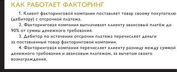 «Факторинг не оценивает риски того, кому он дает деньги. Банк же эти риски оценивает, и если ко всему нет залога, то он деньги не дает. Здесь такой банковский клинч. Я был председателем кредитных комитетов, и, когда мы начали проводить сделки по факторингу, было очень тяжело. В ступор входили все. Да и до сих пор банки не могут этого сделать, они просто пишут, что в их портфеле есть такая услуга, как факторинг, но фактически его не продают. Хотя сейчас Альфа-Банк начал активно двигать факторинг», – поясняет Мулдашев.