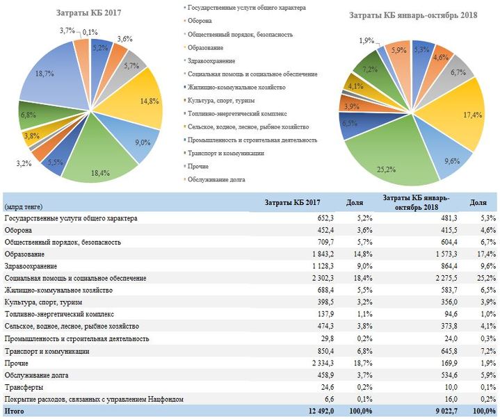Затраты КБ РК составили 9,02 трлн тенге за десять месяцев, или 78,7% от запланированной на весь 2018 суммы. В сравнении с аналогичным периодом прошлого года расходы снизились на 12,0%. Основными статьями расхода бюджета являются: социальная помощь и социальное обеспечение (2,28 трлн тенге), образование (1,57 трлн тенге) и здравоохранение (0,86 трлн тенге).