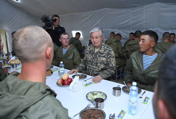 Президент Казахстана не забыл познакомиться и с бытовыми условиями военнослужащих, побеседовав с ними в полевом лагере и столовой.