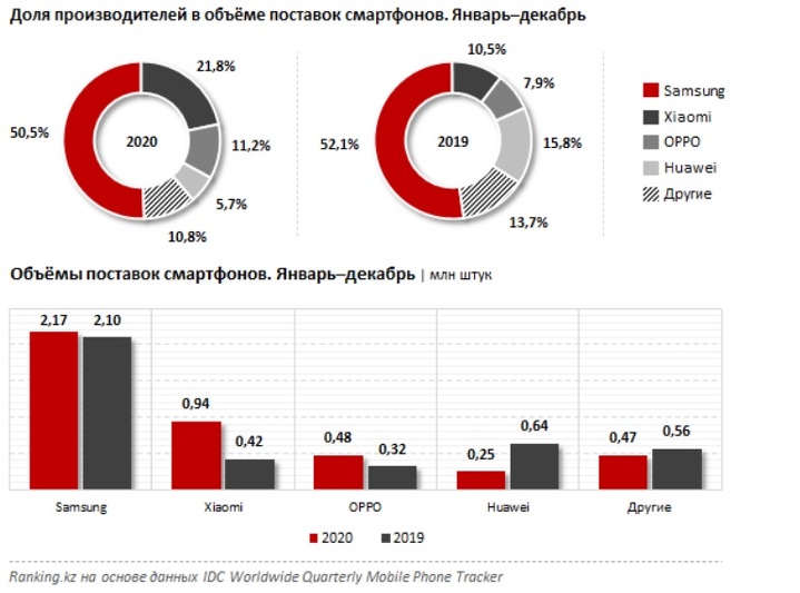 По данным исследовательской компании IDC, изучающей мировой IT-рынок, за 2020 в Казахстан поставили 4,31 млн смартфонов — на 6,7% больше, чем в 2019-м, сообщает Ranking.kz.