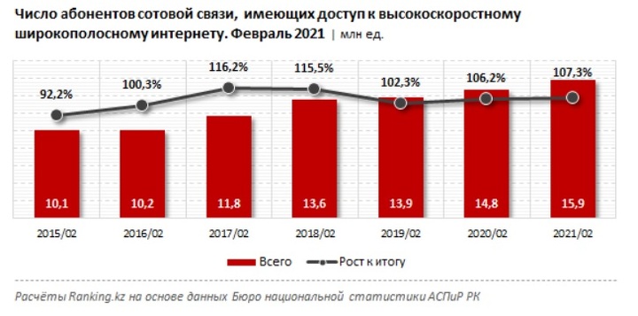 Число абонентов сотовой связи, имеющих доступ к высокоскоростному широкополосному интернету, увеличивается в РК из года в год.
