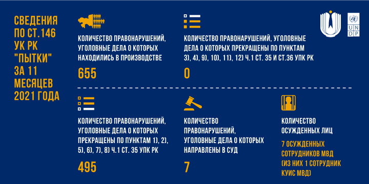 В целом в нынешнем году по статье «Пытки» было осуждено 7 сотрудников МВД РК (из них 1 сотрудник КУИС МВД РК).
