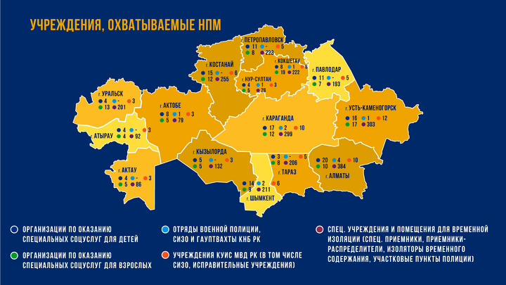 В Казахстане институт НПМ существует и развивается на протяжении 7 лет. В состав участников НПМ, помимо уполномоченного по правам человека, входят отбираемые среди казахстанских граждан члены общественных наблюдательных комиссий и общественных объединений, осуществляющих деятельность по защите прав, законных интересов граждан, юристы, социальные работники, врачи.