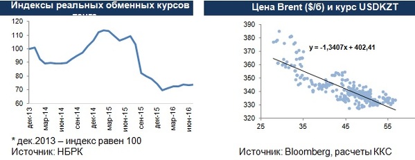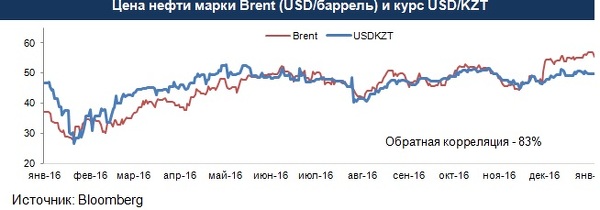 Исходя из динамики курса тенге и цены на нефть, очевидно, насколько высока зависимость курсообразования от цены на нефть. Негативная корреляция между тенге и нефтью с начала 2016 составляет 83%. Поэтому основной тон будет задавать цена на нефть. Однако другие факторы, озвученные выше, тоже будут влиять на курсообразование.