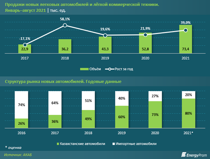 Большая часть продаж новой техники приходится на автомобили отечественного производства: так, по итогам 2020 года доля казахстанских автомашин в продажах составила 73%, против 27% импортных, а за 2021-й, по оценке Ассоциации автомобильного бизнеса Казахстана (АКАБ), доля отечественного автопрома составит 80%.
