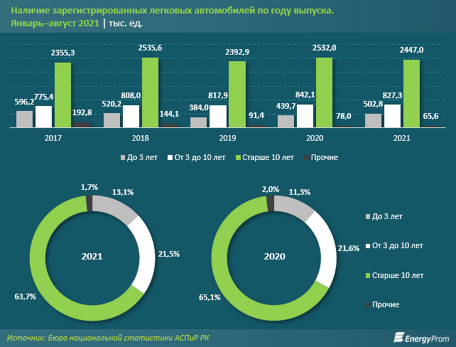 В то же время, несмотря на рост продаж новых авто, поддерживаемый автопромом страны, Казахстан, к сожалению, остаётся также рынком «слива автохлама». Так, по итогам августа текущего года количество зарегистрированных в РК легковых автомобилей составило 3,8 млн, сократившись по сравнению с прошлым годом на 1,3%; при этом автомобили возрастом более 10 лет достигли сразу 63,7% от всего автопарка РК, или 2,4 млн. На автомобили возрастом от 3 до 10 лет приходится ещё 21,5% парка, или 827,3 тыс. машин.