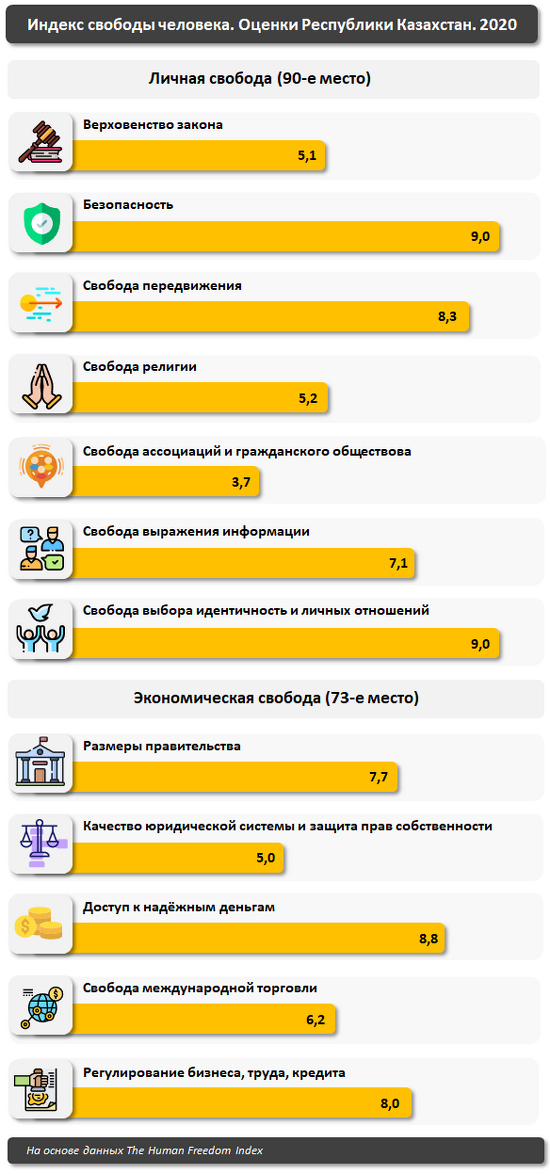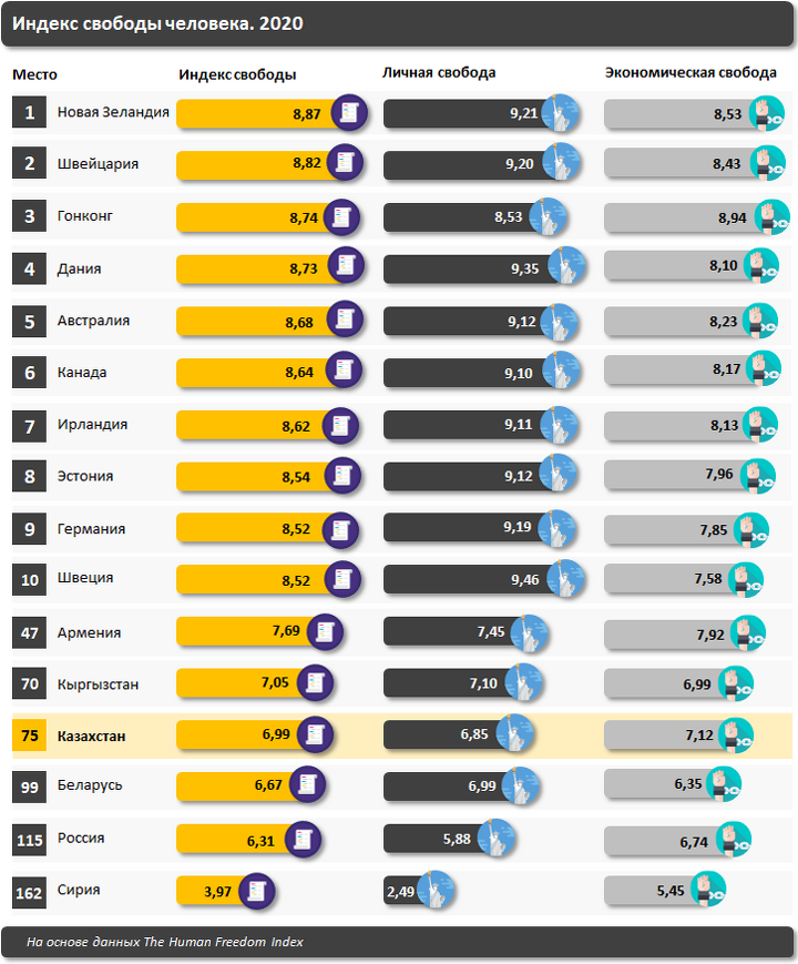 Индекс свободы человека включает два главных компонента — личную и экономическую свободу. Индекс личной свободы Казахстана составил 6,85, экономической — 7,12. Максимальный индекс в рейтинге — 10, что говорит о полной свободе человека в стране, минимальный — 0 — соответственно для стран, где свободы нет.