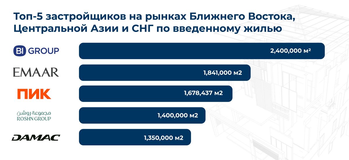 По результатам 2025 года BI Group ввел в эксплуатацию 2,4 млн квадратных метров жилья. Для сравнения, один из наиболее узнаваемых брендов на рынке недвижимости Ближнего Востока — EMAAR — показал результат в 1,84 млн кв. м, а саудовский девелопер ROSHN — 1,4 млн кв. м, арабский DAMAC Properties — 1,35 млн кв. м, Binghatti Properties — 1,05 млн кв. м. Схожая картина наблюдается и на российском рынке: объемы ввода у крупнейшего игрока ПИК (1,67 млн кв. м) также ниже показателей казахстанской компании.